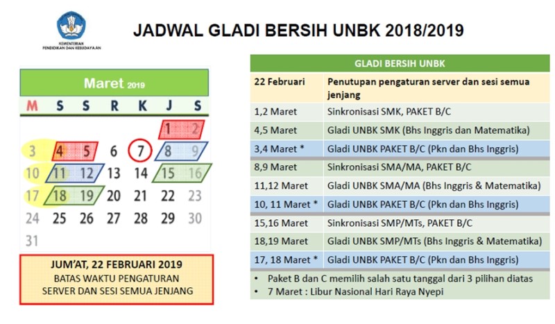 Pelaksanaan gladi bersih UNBK tahun 2019 akan dilaksanakan pada tanggal 18 - 19 Maret 2019